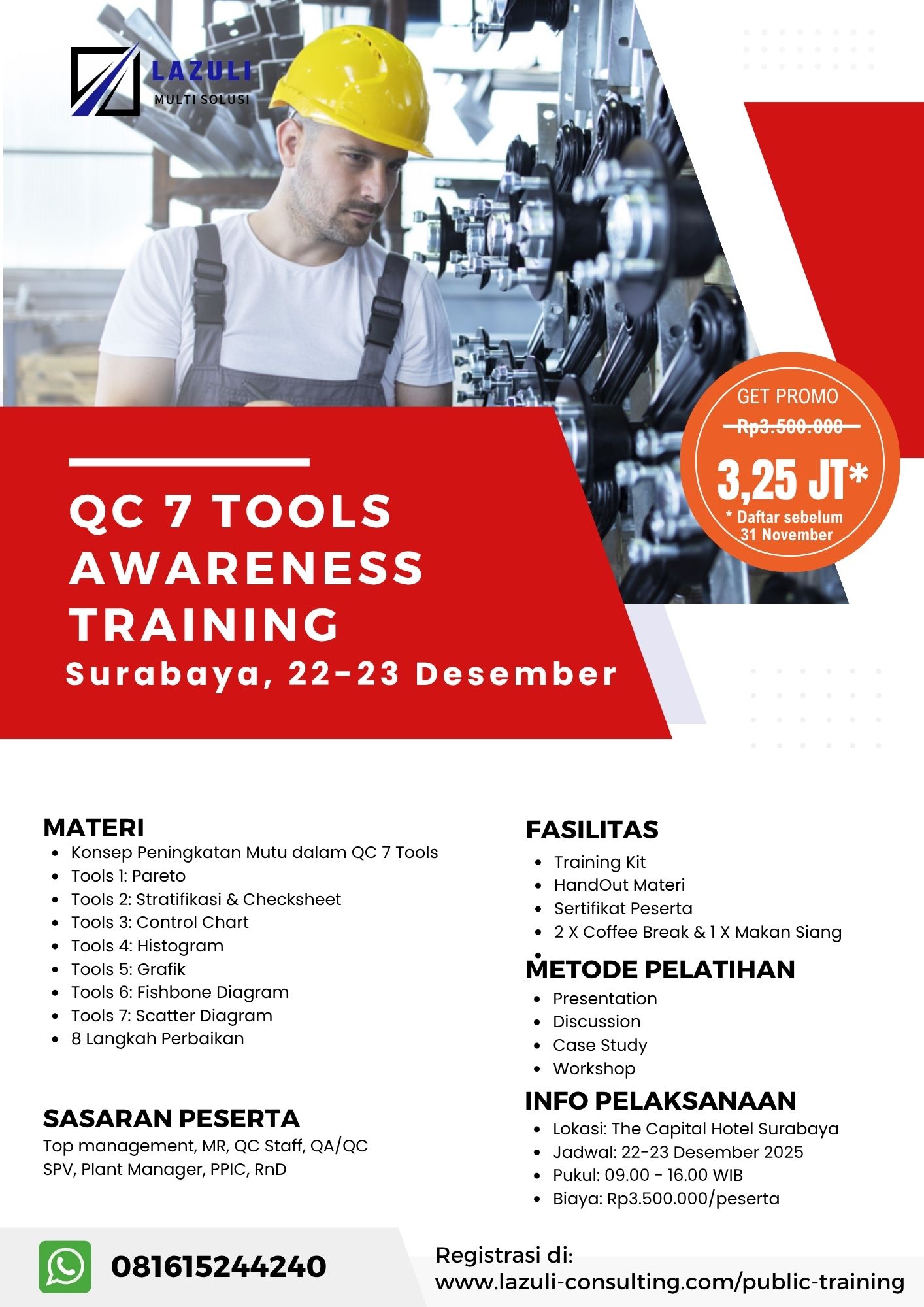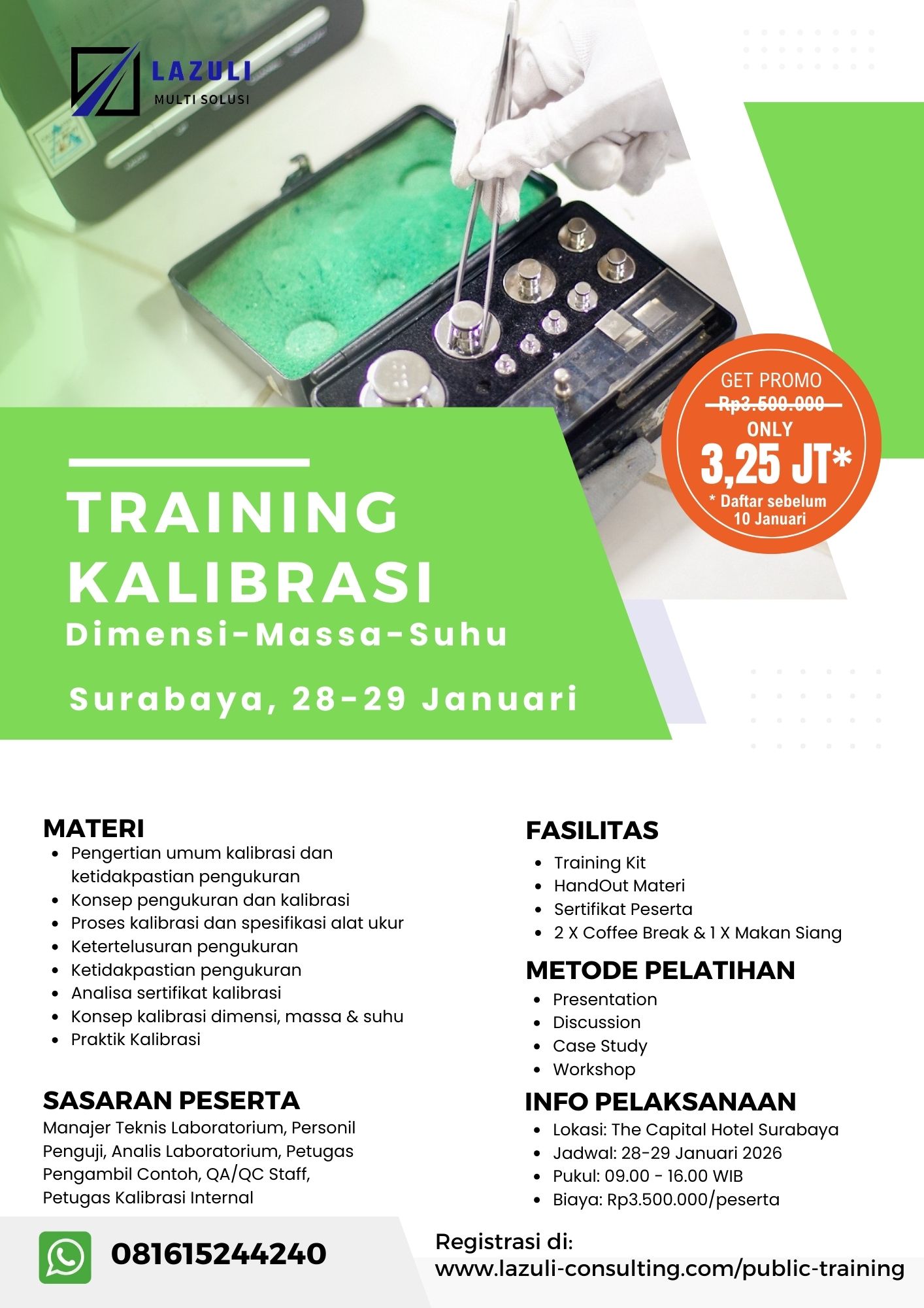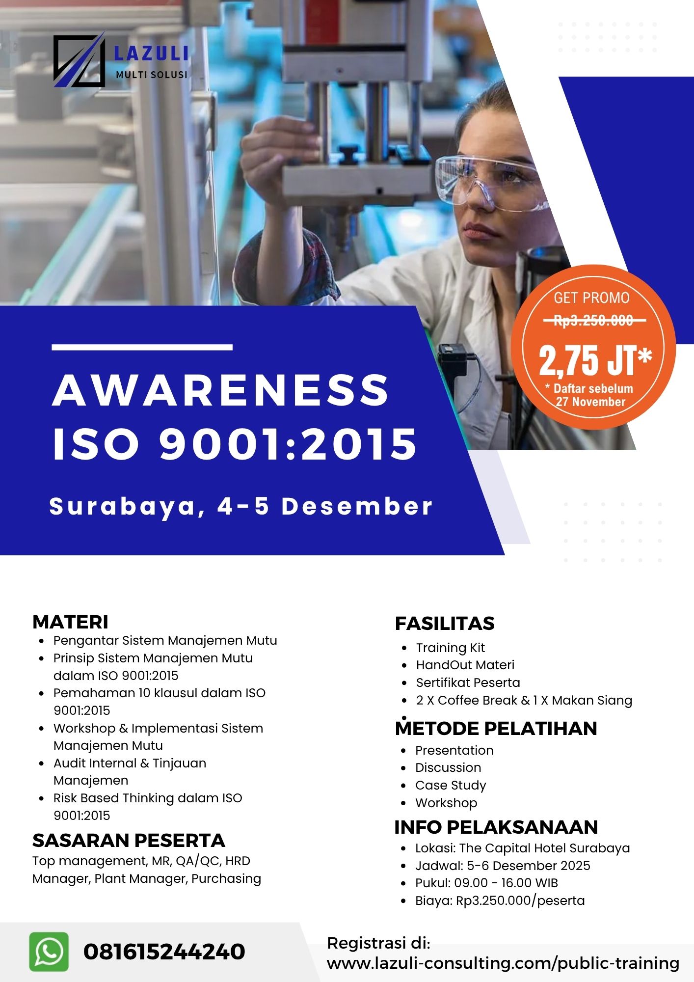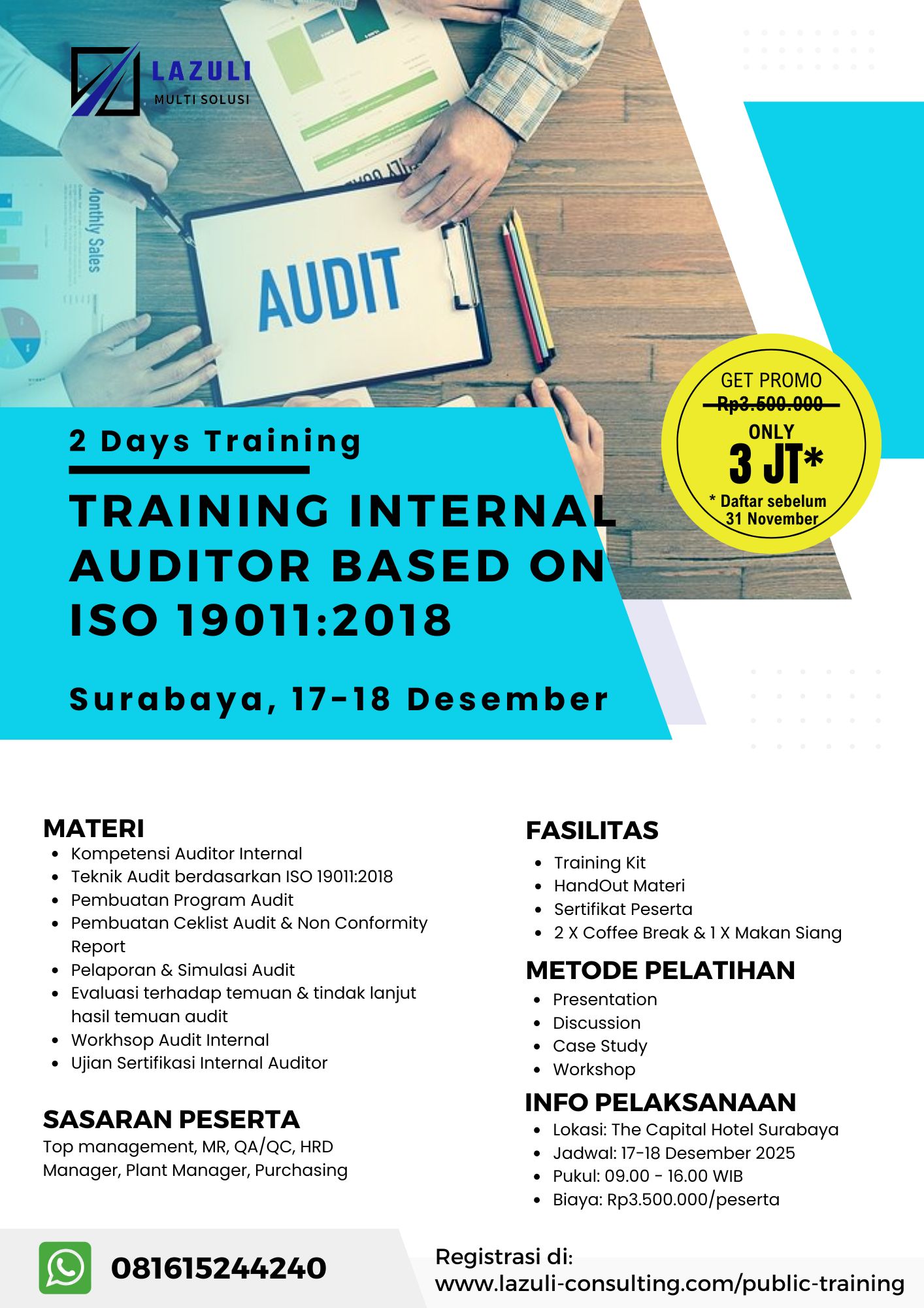 Public training surabaya | lazuli consulting Public Training November - Desember 2025 Download Kalender Public Training 2026 2 Days Training (28-29 Januari 2026)The Capital Hotel, Surabaya Kalibrasi Dimensi, Massa & Suhu Daftar 2 days Training (17-18 Desember 2025)The Capital Hotel, Surabaya Internal Auditor Based on ISO 19011:2018 Daftar 2 days Training (22-23 Desember 2025)The Capital Hotel Surabaya QC 7 Tools Awareness Training Daftar 2 days Training (4-5 Desember 2025)The Capital Hotel, Surabaya Training Awareness ISO 9001:2015 Daftar 2 days Training (29-30 Desember 2025)The Capital Hotel, Surabaya Warehouse Management Daftar